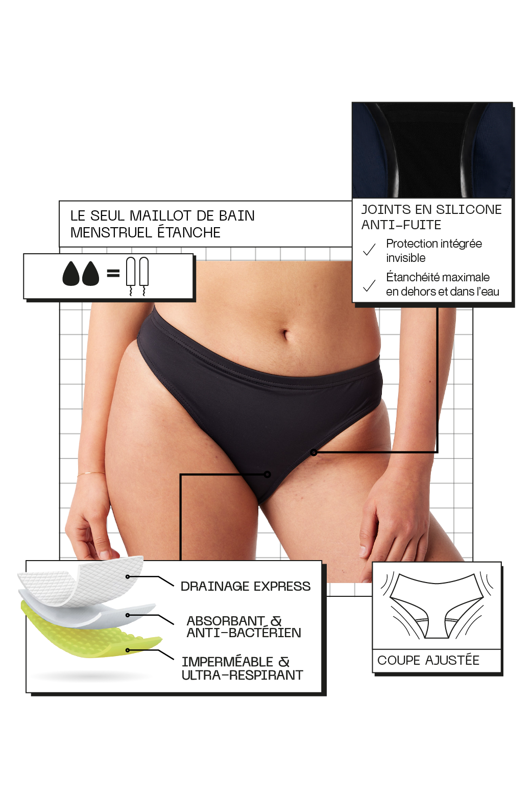 Nos maillots menstruels combinent une protection intégrée en 3 couches ultra-fines (drainante, absorbante, étanche) à des joints en silicone certifiés OEKO-TEX®, qui forment une véritable barrière anti-fuite, aussi bien dans l’eau qu’en dehors.