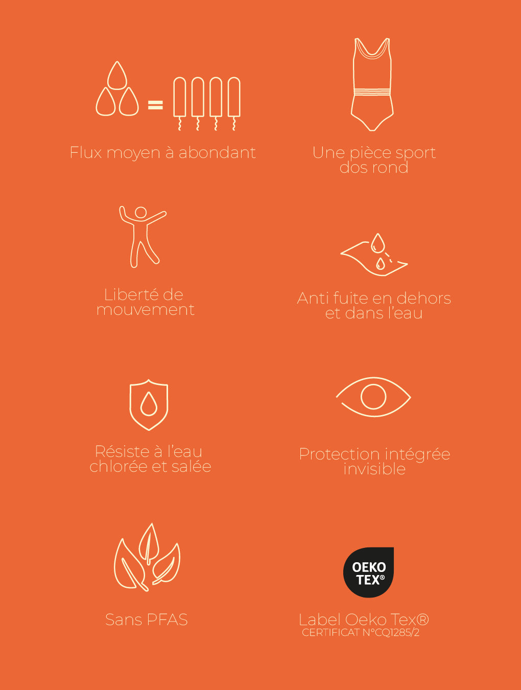 Dank seiner einzigartigen Technologie, die auf einer engen Passform, auslaufsicheren Silikon-Dichtungen und unserem ikonischen Menstruationsmembran basiert, sind unsere Menstruationsbadeanzüge wasserdicht und ermöglichen eine echte Absorption der Periode (entspricht 2 klassischen Tampons) bis zu 12 Stunden.