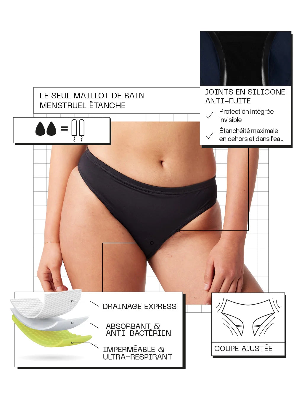 Nos maillots menstruels combinent une protection intégrée en 3 couches ultra-fines (drainante, absorbante, étanche) à des joints en silicone certifiés OEKO-TEX®, qui forment une véritable barrière anti-fuite, aussi bien dans l’eau qu’en dehors.