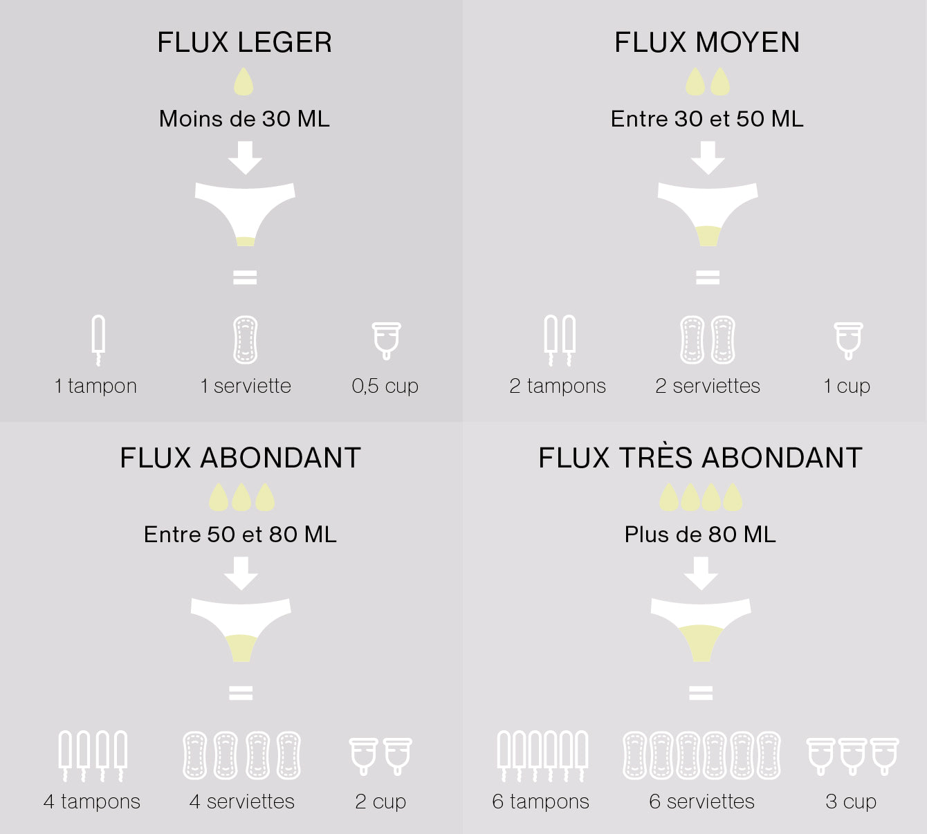 Les pertes au cours d’un cycle se mesurent en ml : un flux moyen correspondra en moyenne à 40ml et un flux abondant en moyenne à 80ml.