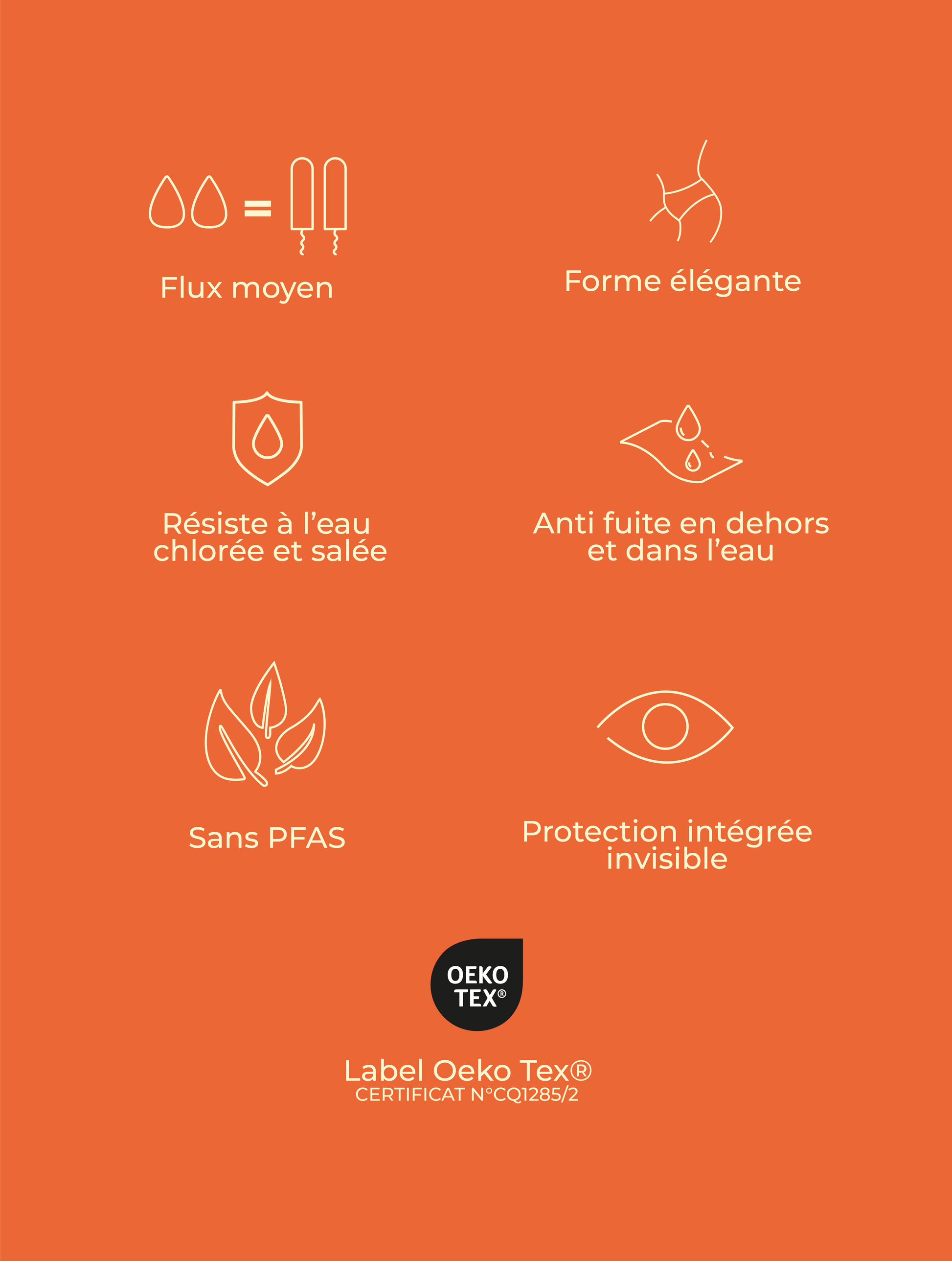 Grâce à sa technologie unique reposant sur l'association d'une coupe ajustée, des joints anti-fuite en silicone et de notre membrane menstruelle iconique, nos maillots de bain menstruels sont étanches et permettent une réelle absorption des règles (équivalente à 2 tampons classiques) jusqu'à 12h.