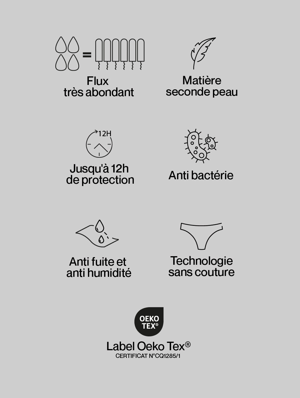 Pensé pour être porté de jour comme de nuit, sa partie absorbante est non seulement plus large mais aussi plus haute à l’avant à l’arrière pour une protection sans faille quelle que soit la position (debout, assise ou allongée).